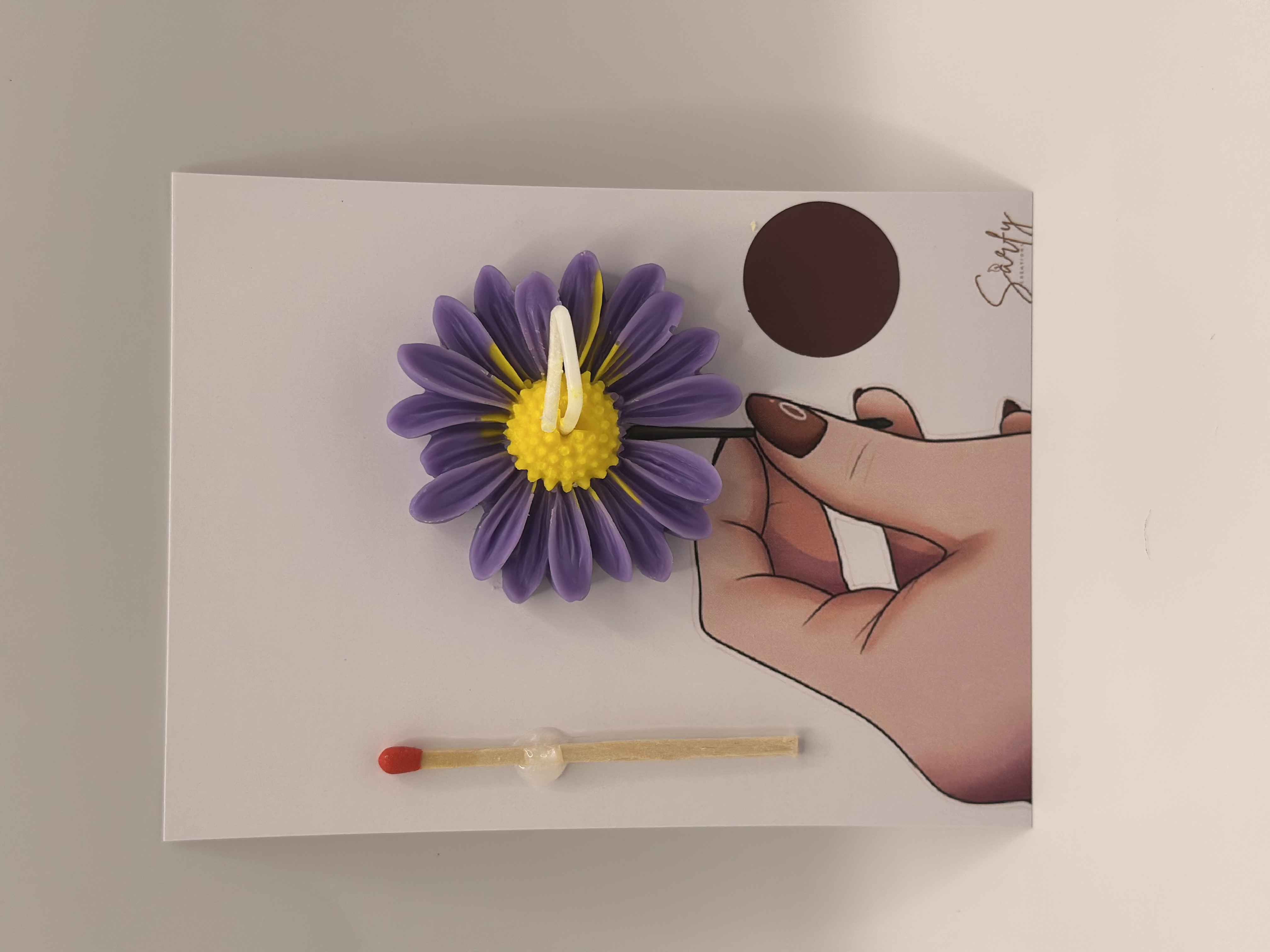 Card Size: 105x140mm.Extra-1 matchstick .1 Matchstriker.Daisy flower candle is scented.SAFETY WARNINGS: